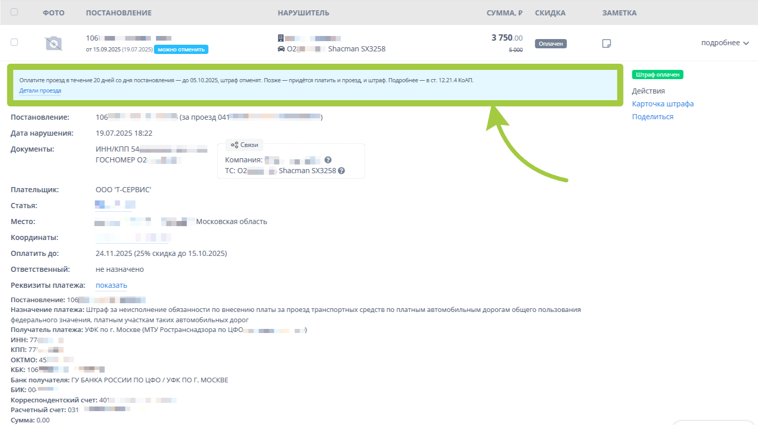 Предположим, что мы оплатили 3750 руб. со скидкой от штрафа в 5000 руб. за проезд в 1214 руб. Важно помнить, Вы оплачиваете штраф за платные дороги, который можно отменить, оплатив проезд (платите только за проезд!). Часто клиенты платят штрафы, не разбираясь, что так можно. Хотя в интерфейсе есть подсказки, пример на скриншоте ниже.