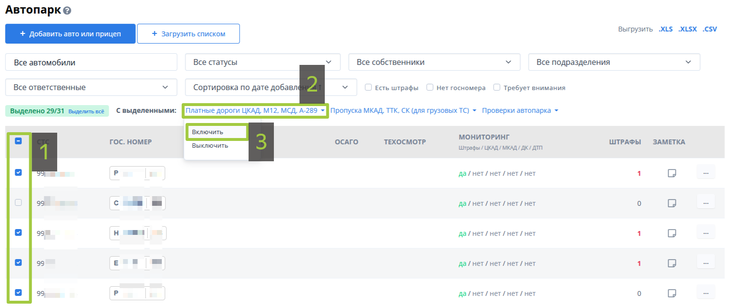 - Выделите все или необходимые для контроля транспортные средства.