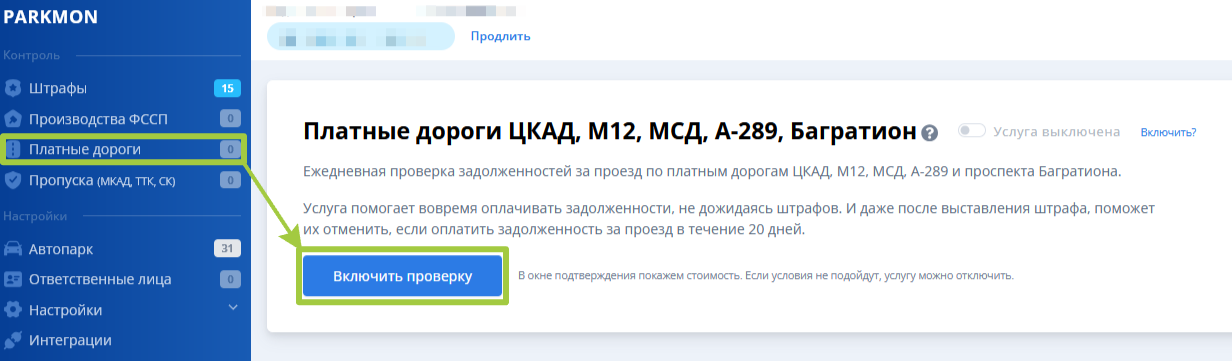 1. Включите контроль проездов по платным дорогам, выбрав пункт «Платные дороги», а затем нажмите «Включить проверку». Пример ниже: