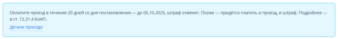 Обычно в таких постановлениях висит синяя рамка (при раскрытии), сообщающая: «Оплатите проезд в течение 20 дней со дня постановления — до 05.10.2025, штраф отменят. Позже — придётся платить и проезд, и штраф. Подробнее — в ст. 12.21.4 КоАП». А также синяя метка «Можно отменить». Статью КоАП так же рекомендуем почитать: ст. 12.21.4 КоАП