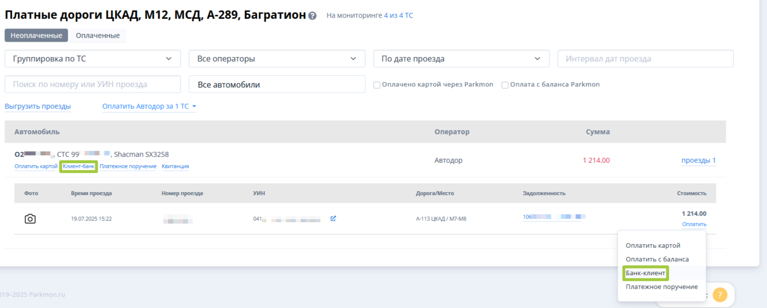 2. Бесплатно оплатить проезд можно выгрузкой в «Клиент-Банк» (только при включенной функции контроля платных дорог).