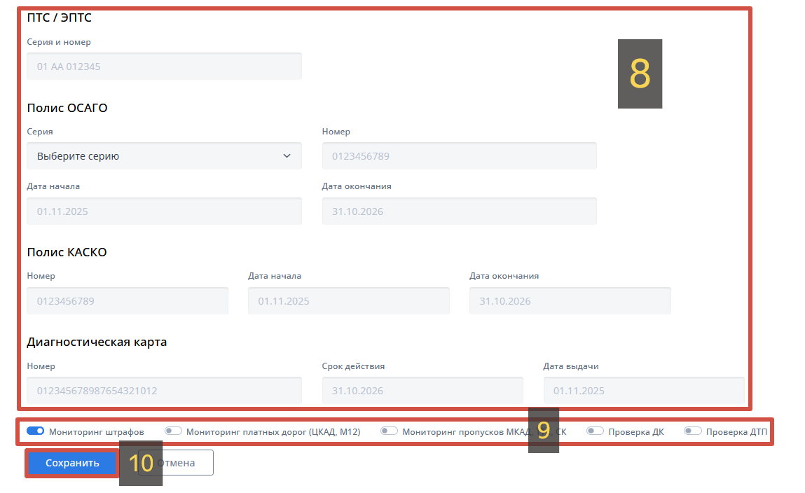 8. Указать ПТС / ЭПТС, полис ОСАГО и КАСКО, диагностическая карта.