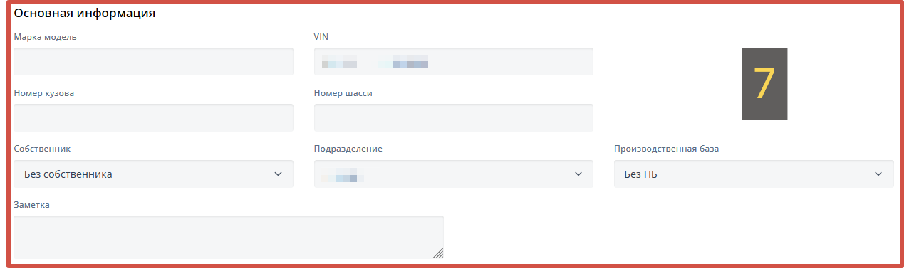 7. В основной информации главное — заполнить марку/модель, VIN, номер шасси, собственника или подразделение, или производственную базу.