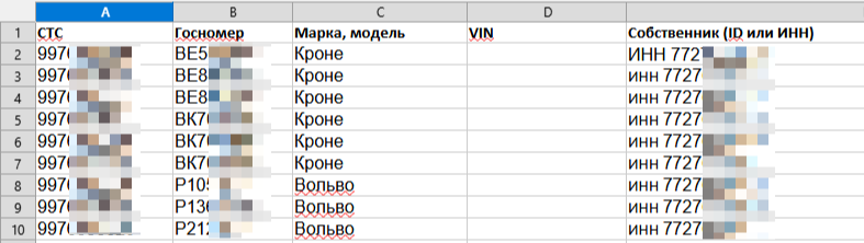 2. Скачайте шаблон. Желательно в XLSX-файле, но можно и в других двух. Заполните его данными своих автомобилей (минимально: ГОСНОМЕР + СТС + МОДЕЛЬ МАШИНЫ). Больше — лучше. Сохраните шаблон.