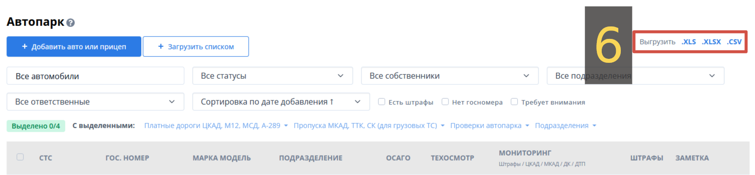 6. Если Вам потребуется в будущем выгрузить все имеющиеся ТС из «Автопарк», воспользуйтесь опцией выгрузки данных. Будет выгружена вся имеющаяся информация, включая VIN, номер, марку/модель и многое другое.