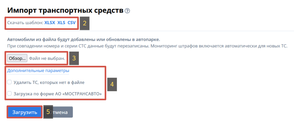 4. Галочки «Удалить ТС, которых нет в файле» и «Загрузка по форме АО «МОСТРАНСАВТО» не трогаем.