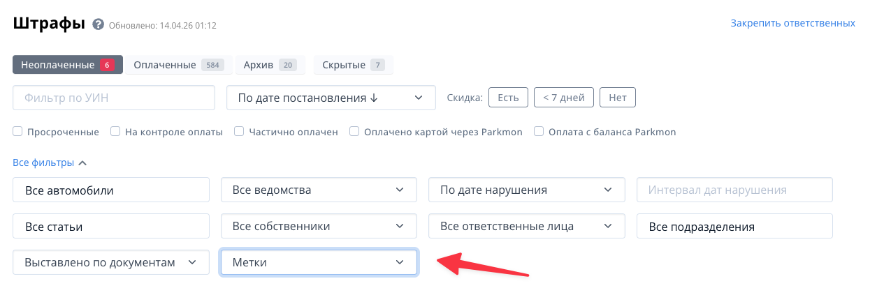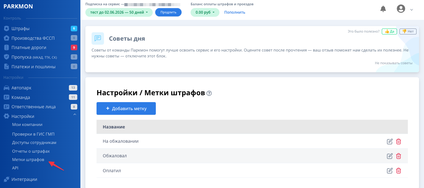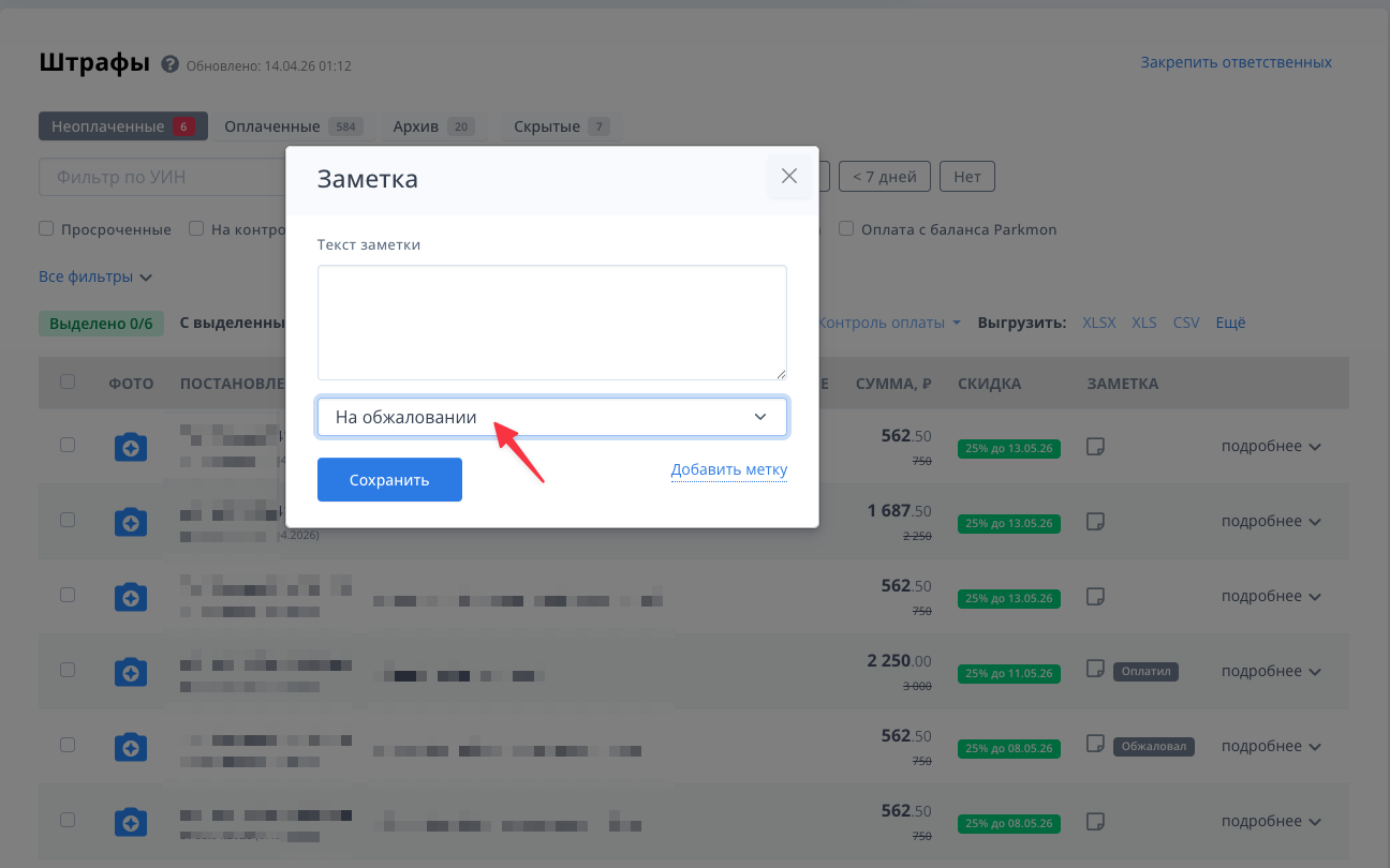 - помогают группировать штрафы (например: «на обжаловании», «проверить», «оплачен»)