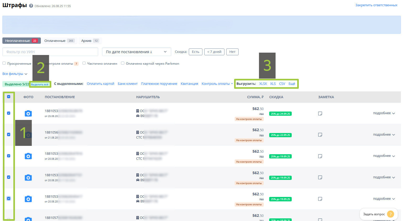 - Все штрафы (если их много) проще и быстрее выделить через «Выделить всё».